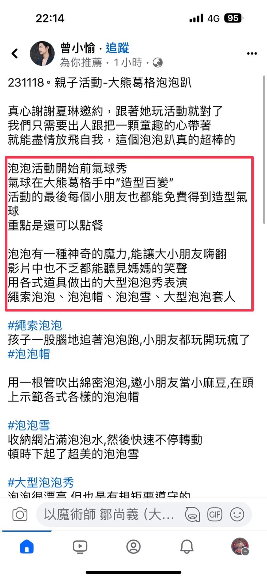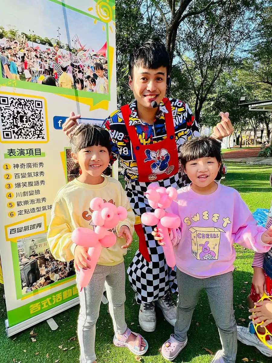 魔術表演、台中魔術師、、魔術秀、魔術商演、尾牙商演、兒童魔術表演、尾牙魔術表演、生日派對表演、氣球秀、造型氣球、腹語表演、川劇變臉、泡泡秀、活動主持人、活動商演 ABOUT 關於我們 魔術師 鄒尚義(大熊葛格) - 魔術表演,川劇變臉,腹語秀,氣球秀,泡泡秀,各式活動表演 笑聲的魔法創造者 自2006年開始學習魔術,大熊葛格累積了超過15年的舞台經驗,表演足跡遍及全台。以高顏值(觀眾認證的😆)幽默風趣的表演風格為特色,深受大小朋友們喜愛。 大熊葛格可以為您帶來魔術、氣球、腹語、川劇變臉、泡泡秀等表演,為觀眾呈現出趣味十足的節目,讓現場活動充滿了笑聲與歡樂。請放心把活動交給大熊葛格! 另外,我的表演不僅僅是一場演出,更是一場獨特的視聽饗宴。而我的舞台生涯是一段精彩的旅程,每一次表演都是與觀眾共同創造美好的瞬間。感謝您的陪伴,讓笑聲在舞台上繼續傳承,讓歡樂永遠伴隨! 0 + 超過15年以上舞台經驗 0 + 服務1000位以上客戶 0 % 客戶滿意度高達99% REVIEWS 客戶好評 榮獲殊榮 2017 魔術魂全國近距離紙牌手法比賽-季軍 2011 桃園縣鬼點子魔術比賽-冠軍 SERVICES 服務項目 01神奇魔術秀 02百變氣球秀 03爆笑腹語秀 04川劇變臉 05歡樂泡泡秀 06造型氣球迎賓 立即預約 SERVICES 服務項目 01神奇魔術秀 一般會結合氣球或腹語秀,若不要氣球&腹語橋段請先告知 02川劇變臉&雙人變臉 03歡樂泡泡秀&泡泡體驗 04氣球姐姐帶動跳 05世界冠軍小丑秀 06定點造型氣球發送 07活動主持人 立即預約 PHOTO 活動花絮 VIDEO 活動影片 123456788 CONTACT 0916-701-491 Facebook-f Instagram Line